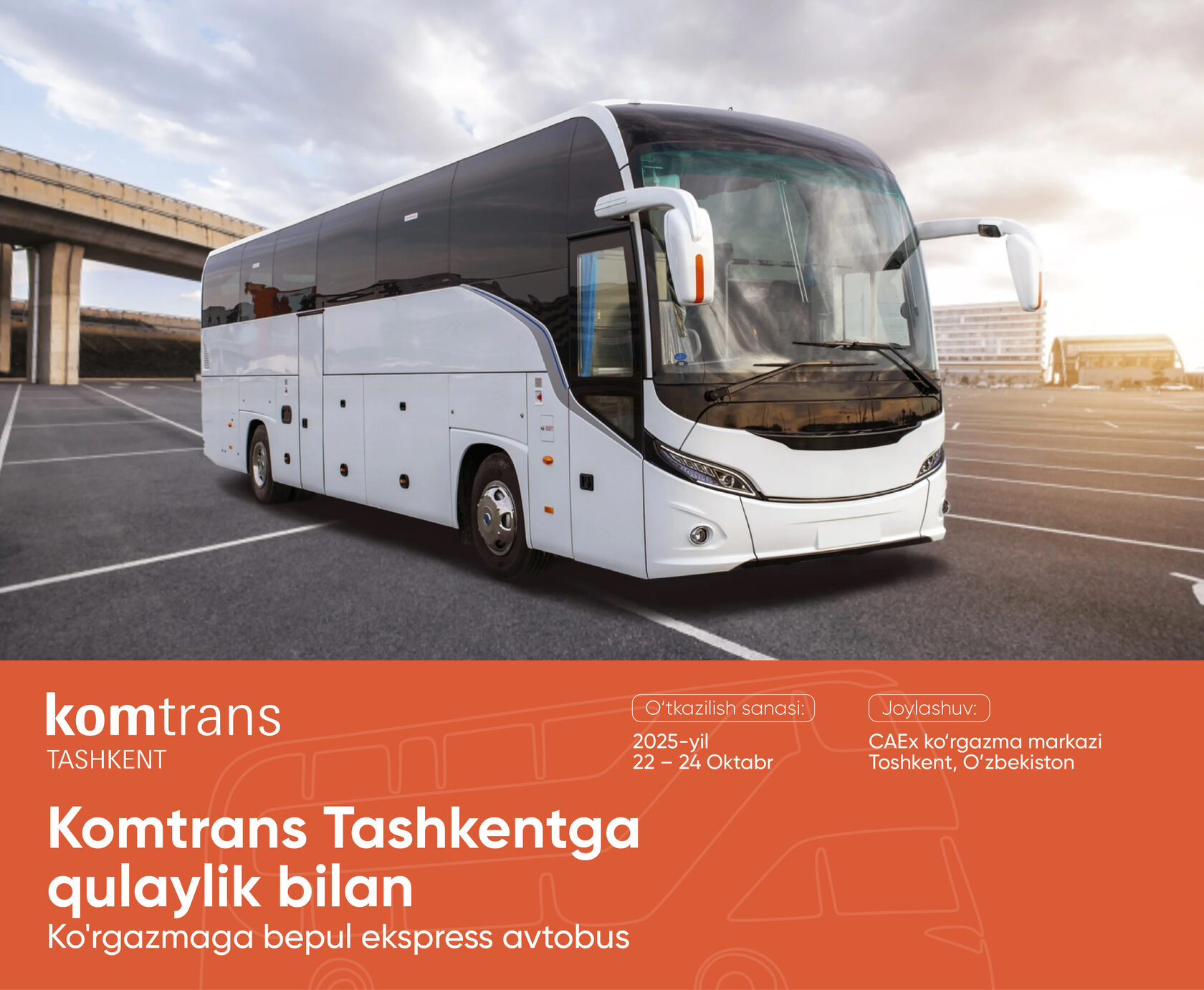 🚍 Ko‘rgazma yakunlangach, CAEx – “O‘zbekiston” mehmonxonasi yo‘nalishi bo‘yicha qo‘shimcha bepul avtobuslar qatnaydi (jo‘nab ketish vaqtlari: 17:00, 17:30, 18:00, 18:30).