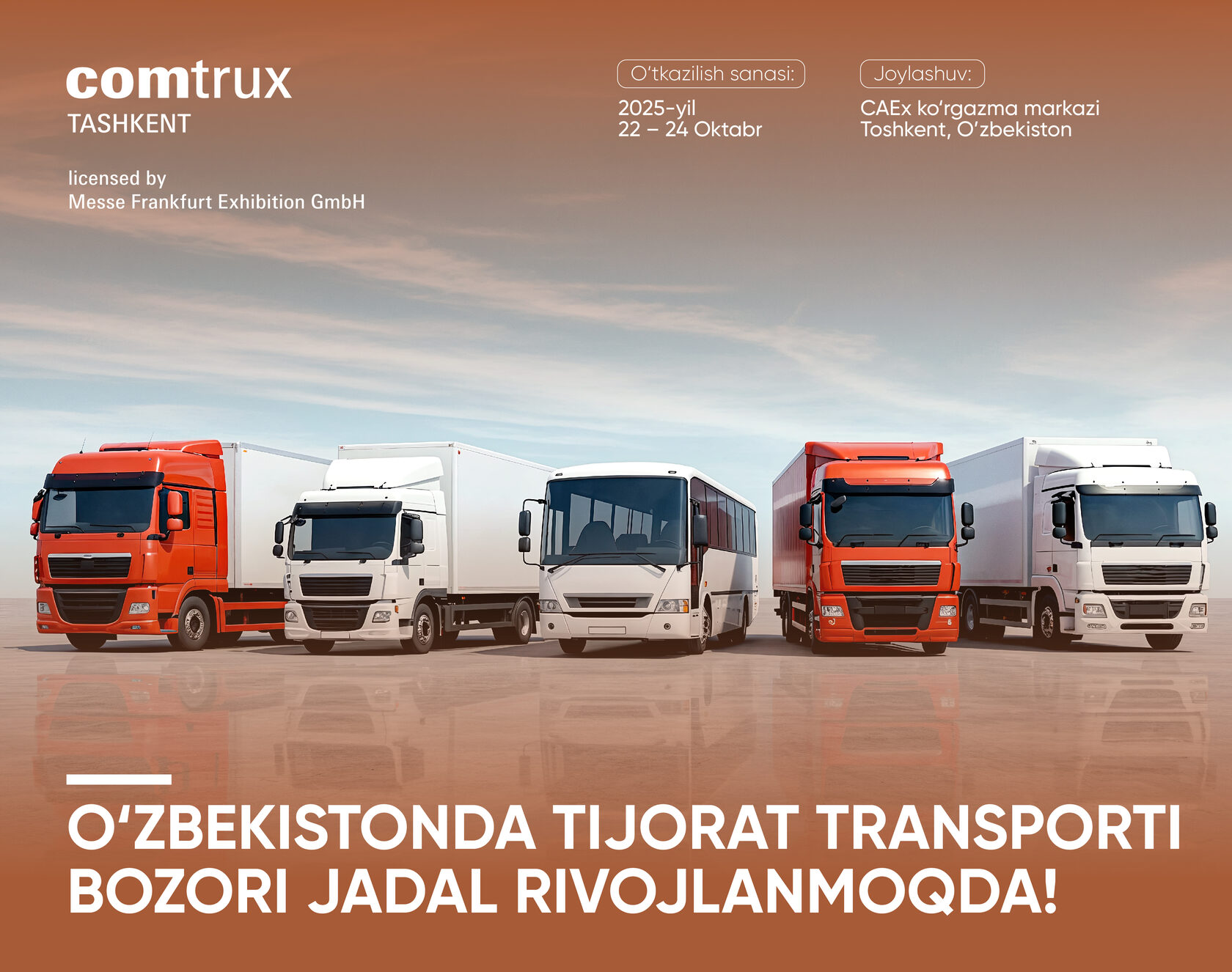 📢 Komtrans Tashkent 2025 — bu ishlab chiqaruvchilar, distribyutorlar va transport kompaniyalari uchrashib, yangi imkoniyatlarni muhokama qiladigan va tijorat transporti sektori uchun ilg‘or texnologiyalarni taqdim etadigan asosiy maydon!